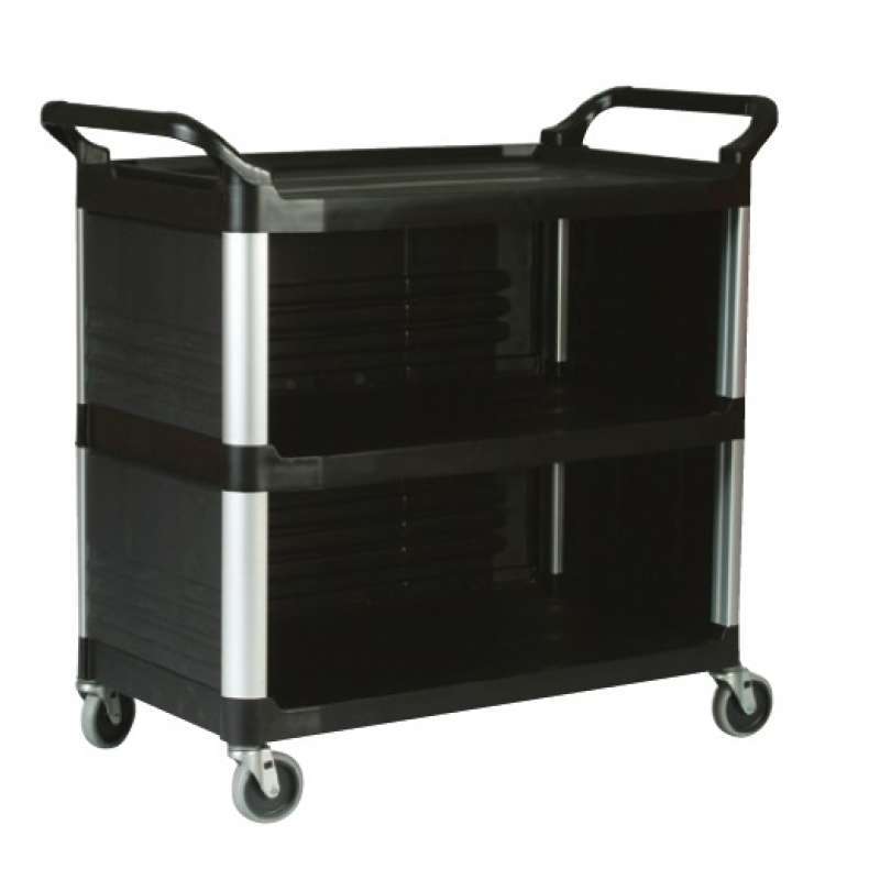 Chariot de service Rubbermaid avec lignes esthétiques, fermé sur 3 côtés idéales pour un usage en salle.