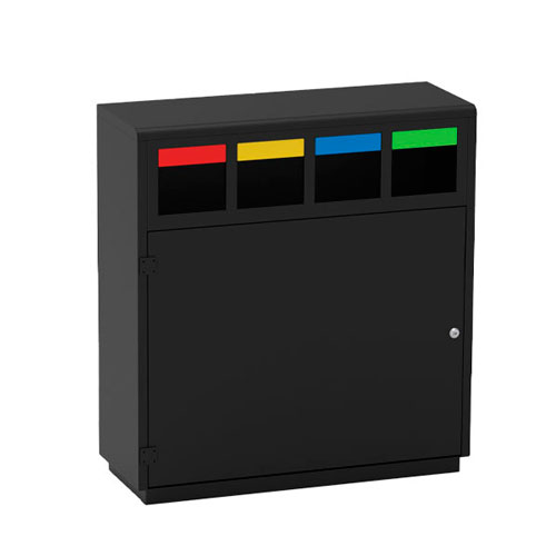 Quatre ouvertures de livraison frontales, avec bandes adhésives colorées.